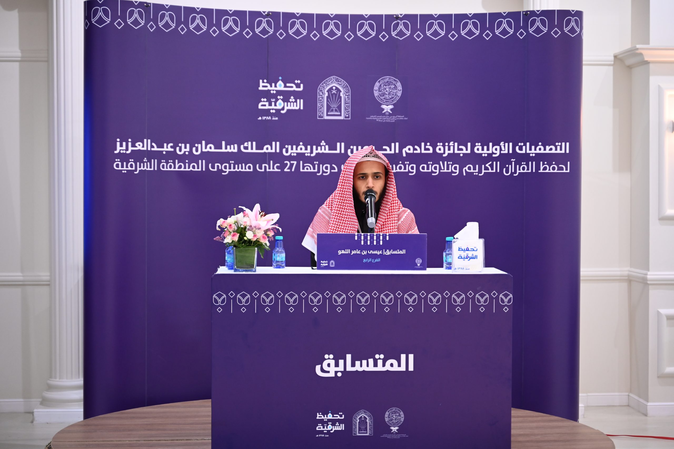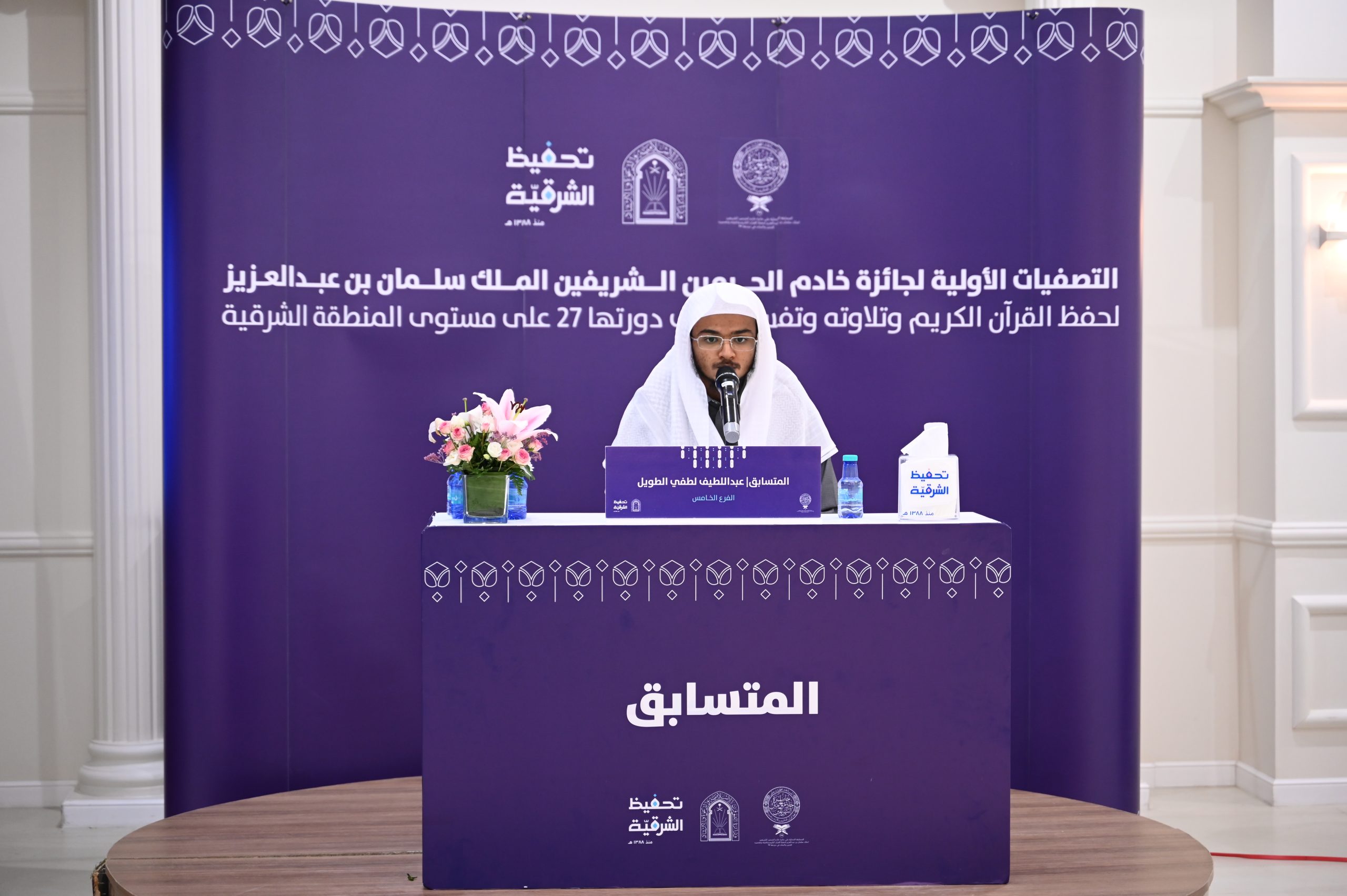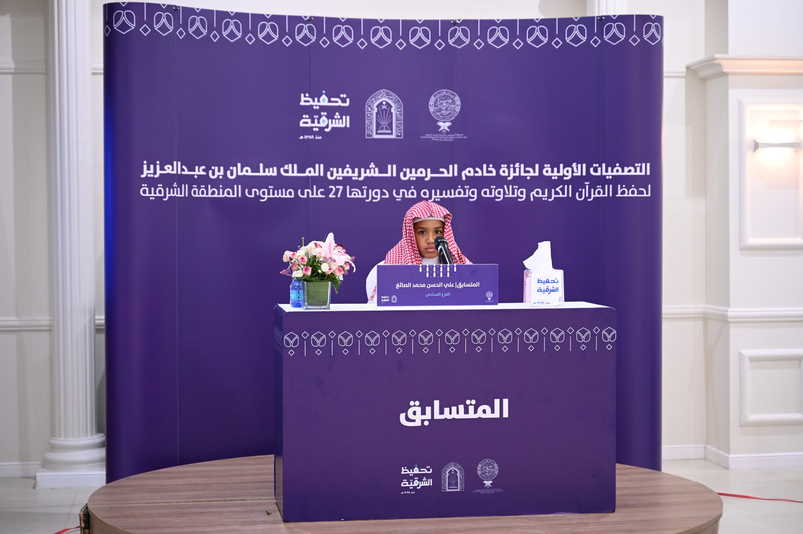نظمت الجمعية الخيرية لتحفيظ القرآن الكريم بالمنطقة الشرقية وبإشراف من فرع وزارة الشؤون الإسلامية والدعوة والإرشاد بالمنطقة الشرقية، التصفيات الأولية لجائزة خادم الحرمين الشرفين الملك سلمان بن عبدالعزيز لحفظ القرآن الكريم وتلاوته وتفسيره للبنين والبنات في دورتها (27) على مستوى المنطقة الشرقية، حيث انطلقت التصفيات يوم الأربعاء 1447/07/04 هـ الموافق 2025/12/24 والتي امتدت لأربعة أيام تنافس فيها المتسابقون على خمسة فروع لحفظ القرآن الكريم.