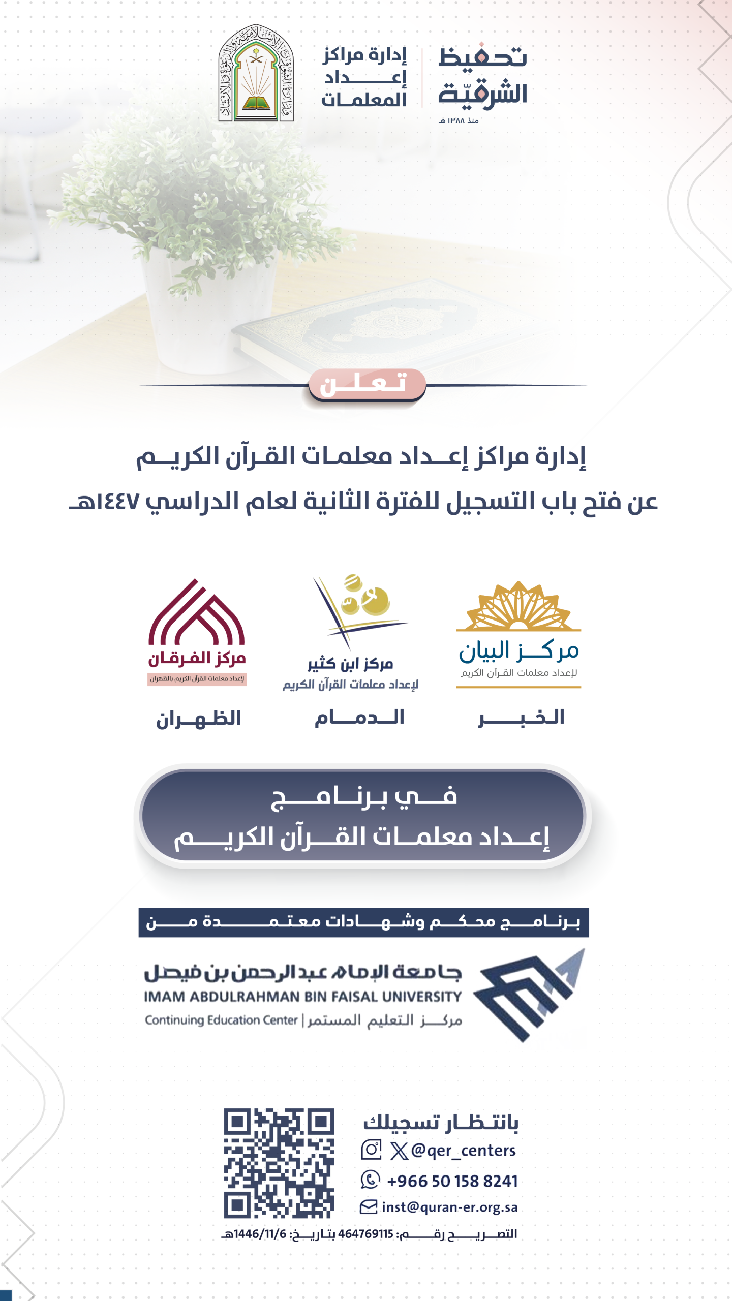 يسر إدارة مراكز إعداد المعلمات أن تعلن عن فتح باب التسجيل في برنامج” إعداد معلمات القرآن الكريم” من جديد لعام 1447هـ