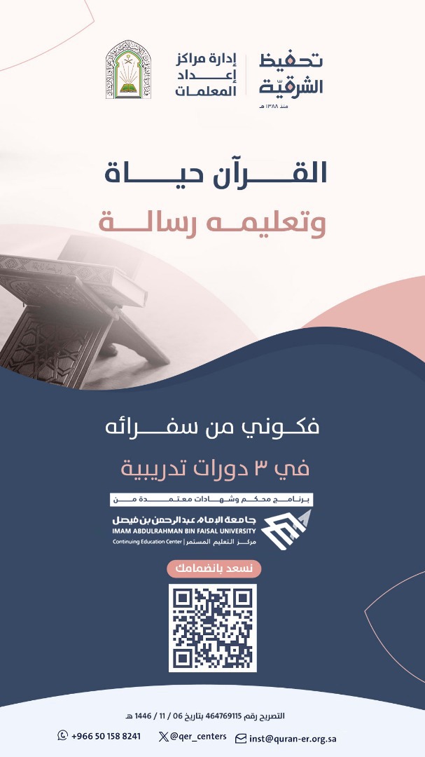 في برنامج إعداد معلمات القرآن، بشهادة معتمدة من جامعة الإمام عبدالرحمن بن فيصل ✅